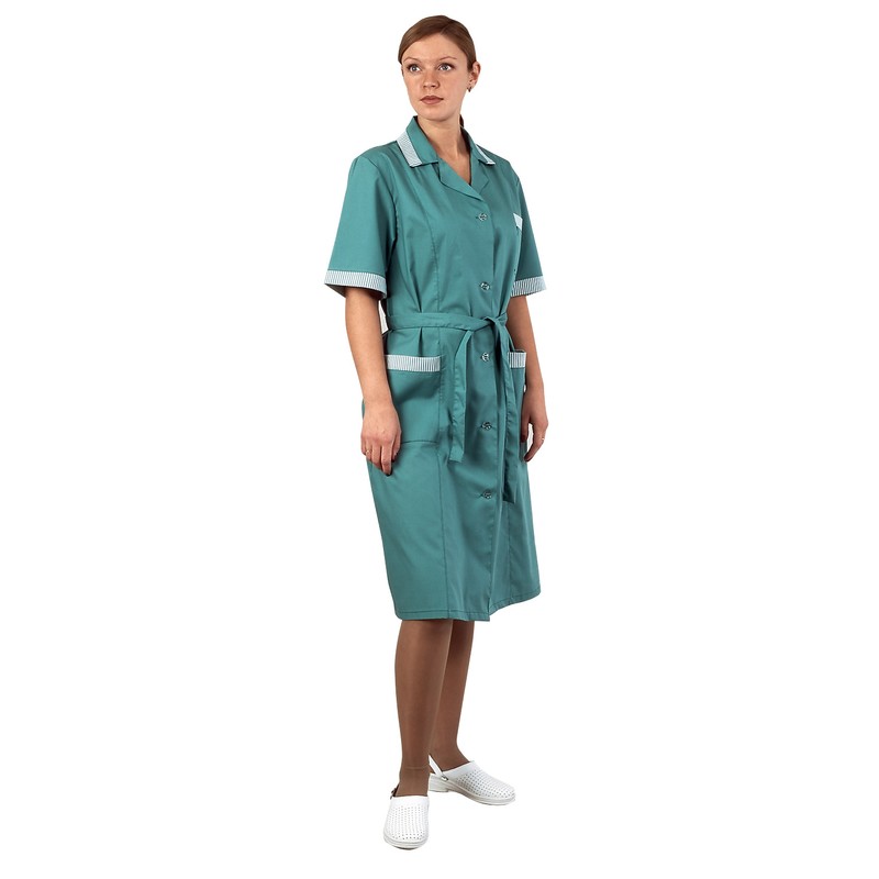 Женский халат для торговли и сферы обслуживания «Вилора», размер 40-42, рост 158-164 см. Изготовлен из ткани бирюзового цвета, состав — 65% полиэфира и 35% хлопка. Рукав короткий. Воротник отложной с лацканами, есть накладные карманы. Отлет воротника, верхние части карманов и края рукавов отделаны светлой тканью. Халат застегивается на пуговицы.