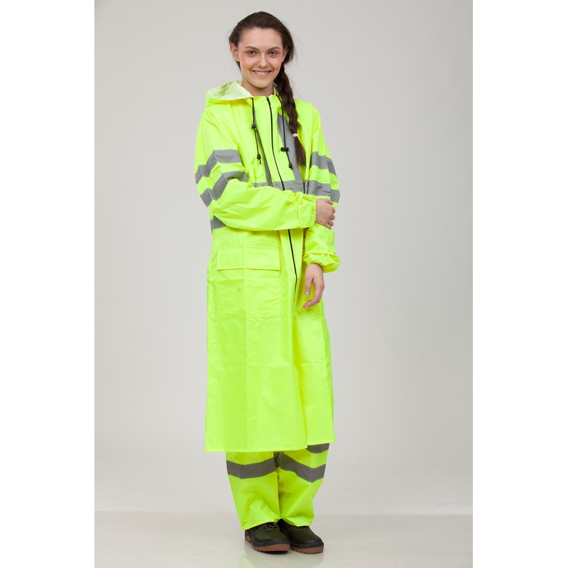 Влагозащитный плащ с центральной застежкой на молнию, двумя накладными карманами. Кулиска на капюшоне дает возможность регулировать объем для комфортной посадки. Цвет лимонный, светоотражающая полоса шириной 50 мм. Все швы плаща загерметизированы специальной лентой. Изготовлен из прочной плащевой ткани с ПВХ-покрытием. Плотность ткани — 225 г/кв.м. Водоупорность — не менее 5000 мм водяного столба. Изделие экологично и соответствует европейским стандартам по содержанию вредных веществ.