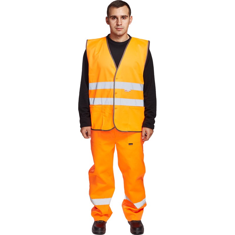 Жилет сигнальный оранжевого цвета с двумя световозвращающими полосами, двумя накладными карманами и центральной застежкой на пуговицы. Ткань плотностью 130 г/кв.м — 100% полиэфир. Ширина светоотражающей полосы составляет 5 см. Сигнальный жилет соответствует 2 классу защиты.