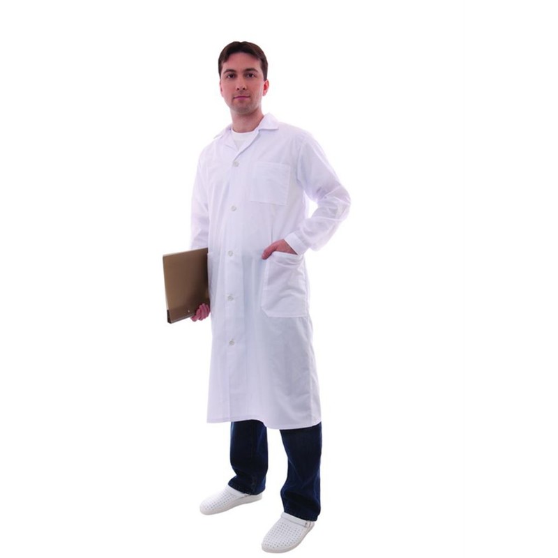 Мужской халат «Медик» белого цвета с отложным воротником. Классическая модель изготовлена из смесовой ткани плотностью 120 г/кв.м, состоящей на 65% из полиэфира и на 35% из хлопка. Застежка центральная, на пуговицах; на лицевой стороне расположены два накладных кармана. Размер халата— 64-66 при росте модели от 170 до 176 см.
