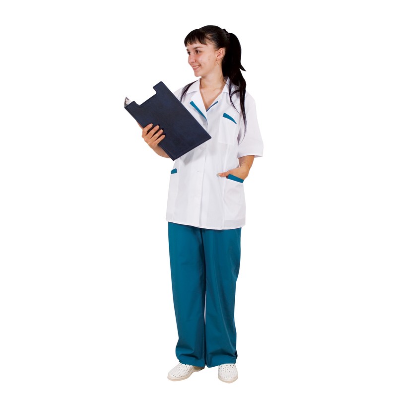 Костюм женский «Лиза» (куртка, брюки). Белая куртка с рукавами до локтя и отложным воротничком оснащена накладными карманами и хлястиком, регулирующим по линии талии ширину; присутствует фигурная синяя отделка на карманах и лацканах. Синие брюки свободного покроя — на резинке. Костюм изготовлен из ткани, имеющей в составе хлопок (35%) и полиэфир (65%). Размер изделия: 64-66, рост: 170-176. Плотность ткани составляет 120 г/кв.м.