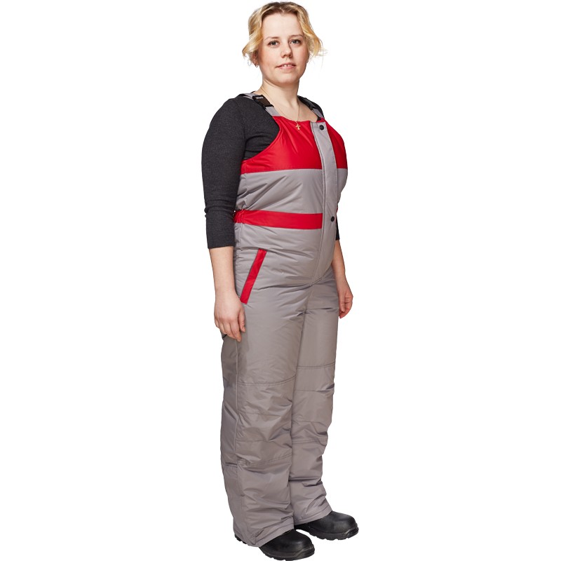 Полукомбинезон женский зимний «Лапландия» с застежкой на тесьму-молнию и ветрозащитным клапаном на кнопках, эргономичными наколенниками и снегозащитной пуфтой. Размер 44-46, рост 158-164, цвет серый с красной отделкой. Обхват талии регулируется эластичной лентой. Верх изготовлен из ткани Hi-Tech membrane (100% полиэстер) — современного высокотехнологичного материала с мембранным покрытием из полиэфирных волокон последнего поколения. Благодаря своим свойствам ткань оптимально подходит для производства одежды с повышенными требованиями износостойкости и комфортности. Водонепроницаемость — 5000, паропроницаемость — 5000 г/кв.м. Полукомбинезон утеплен синтепоном плотностью 200 г/кв.м.