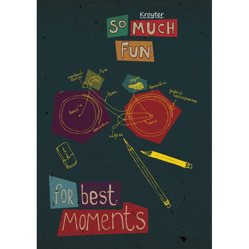 Тетрадь общая представлена в формате А4. Блок выполнен из офсетной бумаги и состоит из 48 листов в клетку. Обложка изготовлена из картона. Дизайн обложки — For best moments. Общая тетрадь скреплена с помощью скрепок.