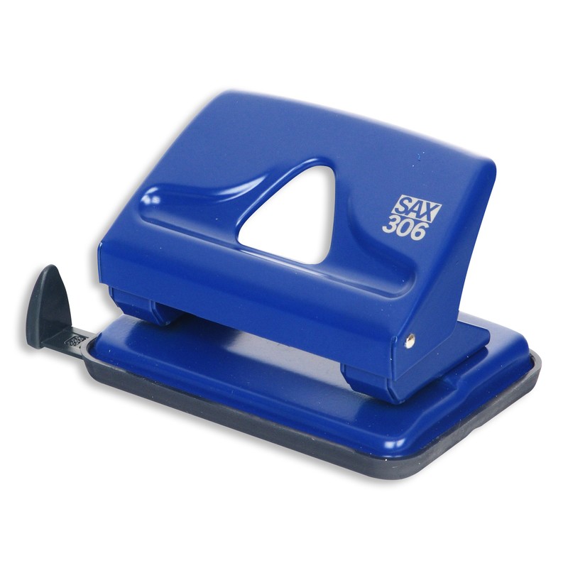 Компактный дырокол Sax 306 применяется для работы с 20 бумажными листами стандартной плотности. Данная модель без усилий может пробить 2 равных отверстия шириной 5.5 мм, расстояние между ними равно 8 см. Конструкция дырокола удобная в использовании, содержит лоток для сбора конфетти и фиксирующую линейку с делениями, которая закрепляет бумагу на нужном расстоянии. Корпус дырокола сделан из металла синего цвета.
