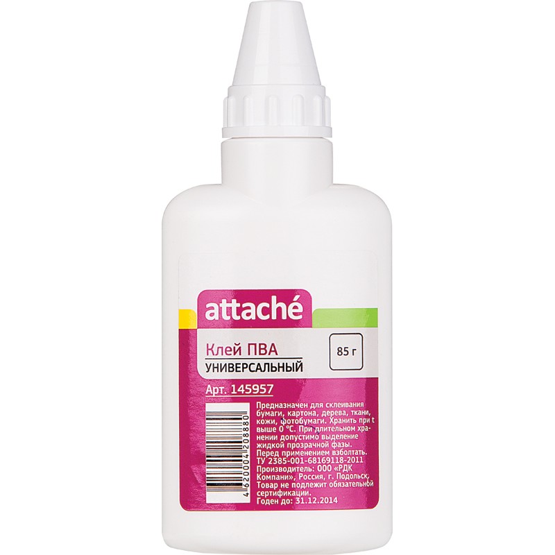 Канцелярский клей ПВА Attache является незаменимым помощником дома и на работе. Небольшой флакон весом 85 г всегда удобно иметь под рукой или носить при себе. Данный клей отлично подходит для занятий творчеством, офисной работы, решения мелких бытовых вопросов. Клей Attache быстро и качественно склеивает поверхности из бумаги, картона, дерева. Клей не теряет своих свойств при низких температурах (предел - 0 градусов Цельсия). Флакон ПВА Attache оснащен съемным колпачком, предохраняющим клей от преждевременного пересыхания.