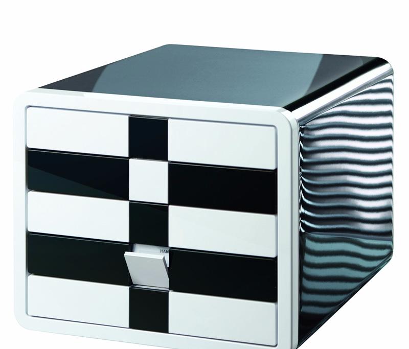 Бокс для хранения документов формата А4. Глянцевая поверхность корпуса в комбинации черного и белого цвета.