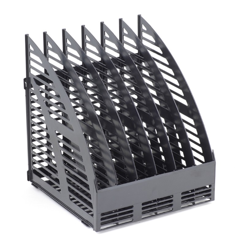 Вертикальный накопитель является полезной канцелярской принадлежностью, которая поможет навести порядок на рабочем столе. Данный накопитель являет собой цельную конструкцию, которая создана для сортировки и хранения бумаг, документов, писем, счетов, каталогов формата А4. Данная модель состоит из 6 равных отсеков по 40 мм, в которых бумаги можно хранить вертикально. Накопитель изготовлен из качественного черного пластика, его габариты — 240х235х285.