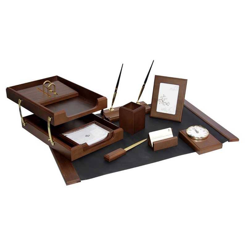 Настольный набор Stockholm включает в себя 10 предметов, изготовленных из орехового дерева, с добавлением фурнитуры цвета золота. Цвет дерева имеет очень приятный оттенок, наполняющий светом и теплом ваше рабочее пространство. Комплект состоит из 10 предметов, составляющих одну большую яркую и нарядную композицию. Это и подставка для календаря, и подставка для визиток и бумаг для записей, лоток, имеющий два яруса, с подвижной верхней частью. В набор также входят подставка для канцелярских принадлежностей, имеющая устойчивое квадратное основание, подставка для двух шариковых ручек, фоторамка и часы. И аккуратный черный коврик.