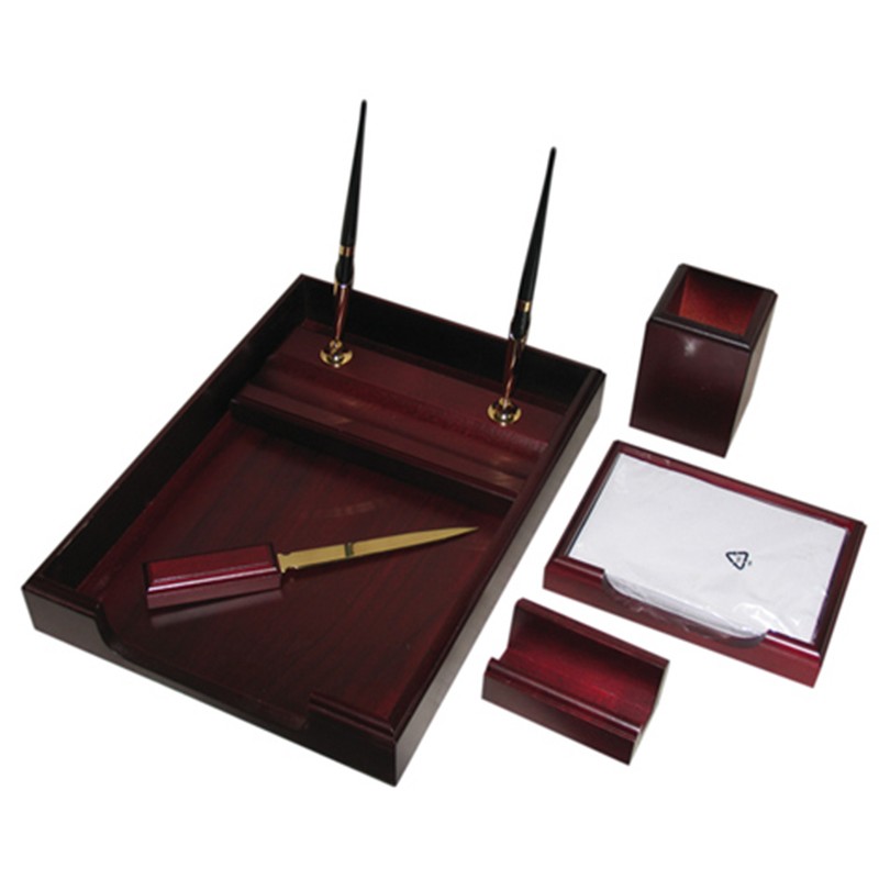Настольный набор San Antonio выполнен из лакированного красного дерева с металлической отделкой золотистого цвета. В состав настольного набора входят 6 предметов, необходимых на рабочем столе руководителя: подставки для бумаг, бумажного блока (формат 10×15 см) и визиток, держатель с двумя ручками, нож для корреспонденции, стакан для карандашей.