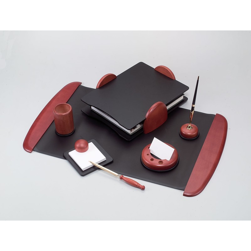 Комплектация (7 предметов): 2-ярусный лоток для бумаг без смещения, блок бумаги с подставкой, нож для вскрытия конвертов, подставка с 1 шариковой ручкой, подставка для карандашей, подставка для конвертов и визитных карточек, коврик на стол. Размер коврика: 41х68