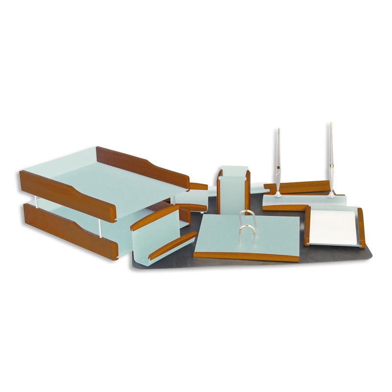 Если вы любите все необычное и нестандартное, яркое и эффектное - тогда стильный набор от Good Sunrise это то, что вам нужно. Он выполнен из акрила в нежном зеленом цвете, с добавлением элементов красного дерева и золотой фурнитуры. В него входит достаточно большое количество предметов, поэтому ваша рабочая зона будет выполнена в одном стилевом и цветом решении. Это и разнообразные подставки для бумаг, карандашей, ручек, конвертов, визиток, календарей. И лотки для бумаг и конечно же настольный коврик.