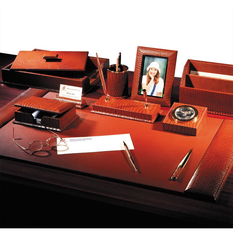 Невероятно красивый, роскошный набор класса люкс станет прекрасным украшением вашего рабочего стола. Подчеркнет ваш статус и должность. Данный комплект выполнен из натуральной светло-коричневой кожи, имитирующей текстурную крокодиловую отделку. Набор включает в себя не только канцелярские принадлежности, но и некоторые предметы интерьера, такие как настольные часы, а также рамка для фотографий. В комплект входит все, что будет вам необходимо для повседневной работы, это и стакан для различных письменных принадлежностей, и канцелярский нож, бумага для записей 10х15 на подставке, подставка для ручек и визитных карточек, пенал для документации, с крышкой. А также коврик 34х20х0,5 см.