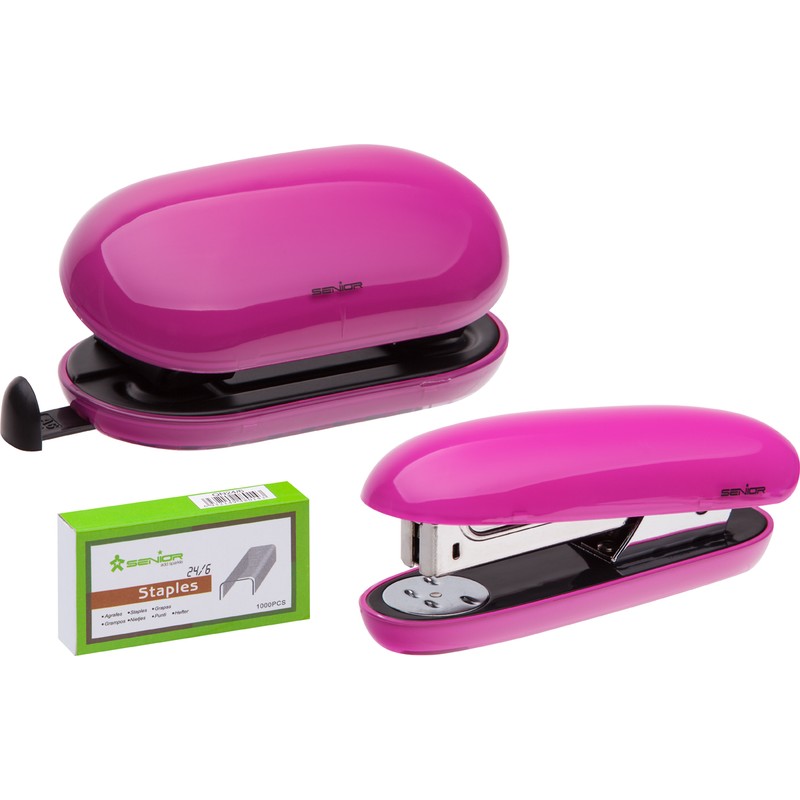 Настольный набор Senior яркого розового цвета, корпусы предметов выполнены из прочного пластика. В состав входят: степлер с загрузкой до 15 листов и скобы размером 24/6, а также дырокол с одновременным пробиванием до 15 листов (количество отверстий 2, диаметр 6 мм, с расстоянием 80 мм. Дырокол оснащен выдвижной линейкой. Всего 3 предмета. Набор упакован в коробку с прозрачными окошками.