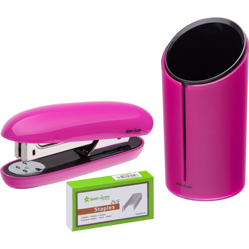 В состав настольного набора Senior входят: степлер с загрузкой до 15 листов, канцелярские скобы № 24/6, стакан для ручек диаметром 6 см со скошенным верхом. Корпус степлера и стакан выполнены из прочного гладкого пластика розового цвета. Высота стакана для ручек 13 см. Настольный набор продается в упаковке с прозрачным окном.