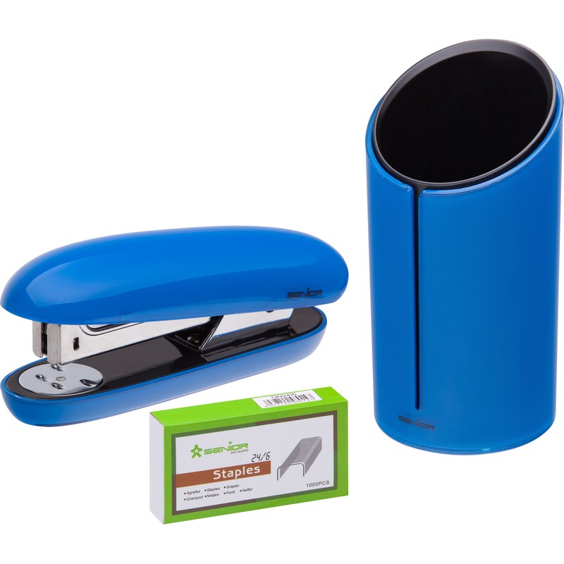 В состав настольного набора Senior входят: степлер с загрузкой до 15 листов, канцелярские скобы № 24/6, стакан для ручек диаметром 6 см со скошенным верхом. Корпус степлера и стакан выполнены из прочного гладкого пластика синего цвета. Высота стакана для ручек 13 см. Настольный набор продается в упаковке с прозрачным окном.