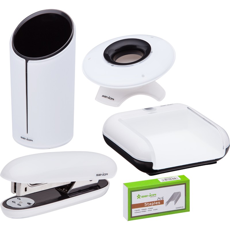 Настольный набор Senior белого цвета, корпусы предметов выполнены из прочного пластика. В состав входят: стакан для ручек диаметром 6 см со скошенным верхом, скрепочница, подставка для блок-бумаги, степлер с загрузкой до 15 листов и скобы размером 24/6. Высота стакана для ручек 13 см. Набор упакован в коробку с прозрачными окошками.