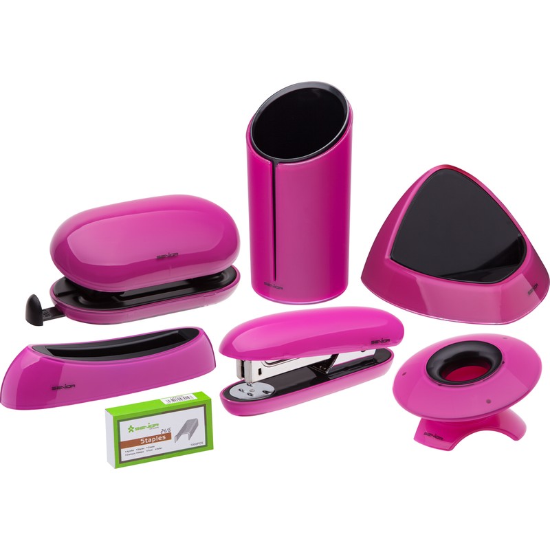 Настольный набор Senior яркого розового цвета, корпусы предметов выполнены из прочного пластика. В состав входят: