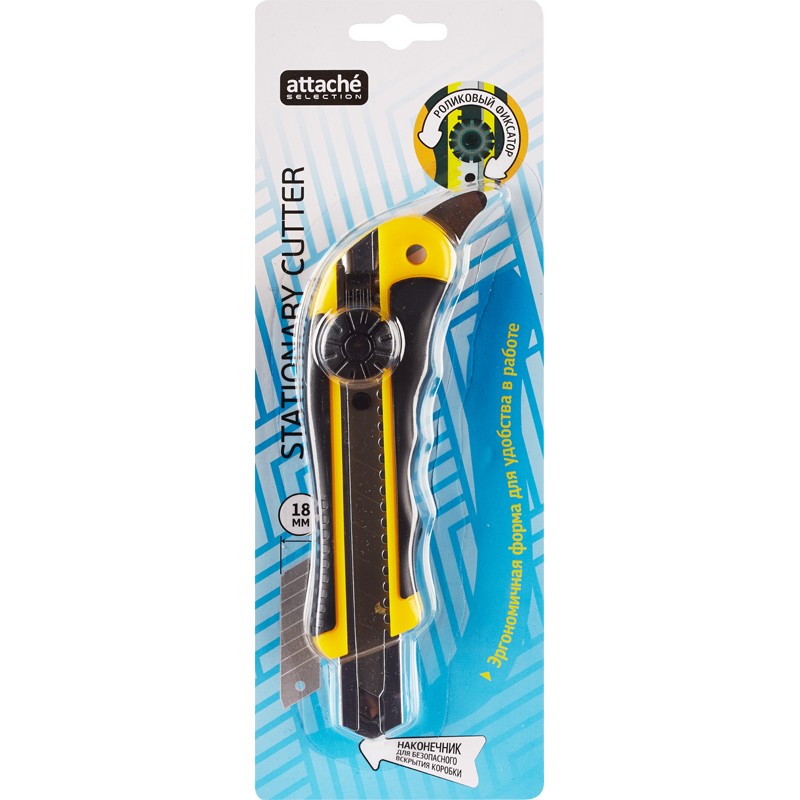 Канцелярский нож марки Attache применяется в качестве режущего средства для разных материалов, отлично справляется с резкой плотного картона. Данная модель оснащена лезвием шириной 18 мм, которое в случае необходимости удерживается роликовым фиксатором. Корпус ножа выполнен в удобной анатомической форме, материал изготовления — металл с резиновыми вставками.