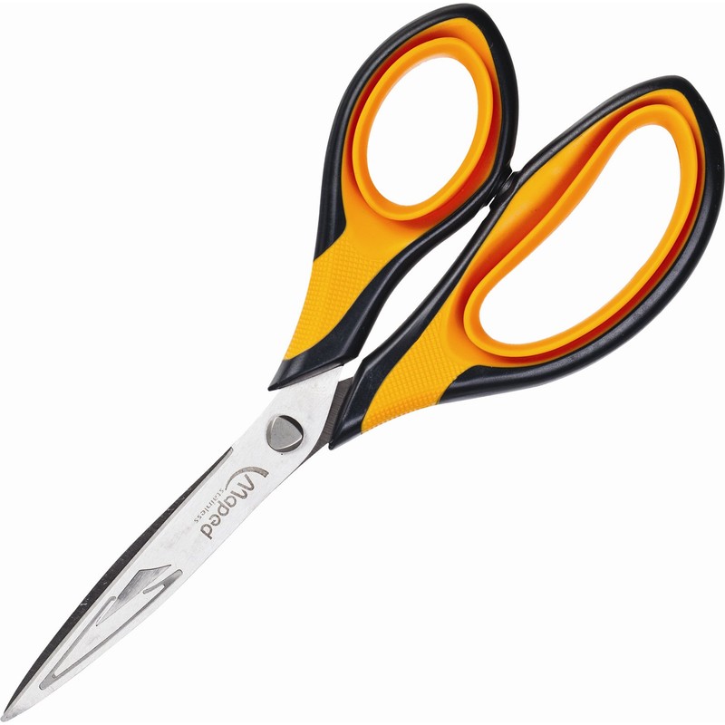 Канцелярские ножницы (офисные) Maped эргономичного дизайна. Лезвия, изготовленные из высокоуглеродистой легированной стали толщиной 2,5 мм, обладают повышенной прочностью. Для оформления ручек выбрана комбинация из двух цветов: черный и оранжевый. Кольца имеют анатомическую форму для естественного положения инструмента в руке. Двойное мягкое покрытие обеспечивает комфортную работу с различными материалами. Длина ножниц — 18 см. Изделие представлено на картонной подложке.