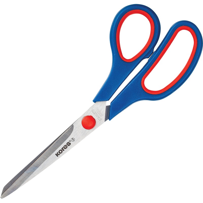 Канцелярские ножницы (офисные) Kores эргономичного дизайна. Для оформления колец выбрана комбинация из двух цветов: синий и красный. Лезвия выполнены из нержавеющей стали. Пластиковые ручки анатомической формы оснащены прорезиненными манжетами, предотвращающими скольжение пальцев. Длина ножниц — 21 см.