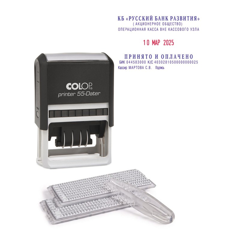 В комплекте: датер с рифленой пластиной, касса букв, пинцет, двухцветная сменная подушка E/55 (арт. 3256)