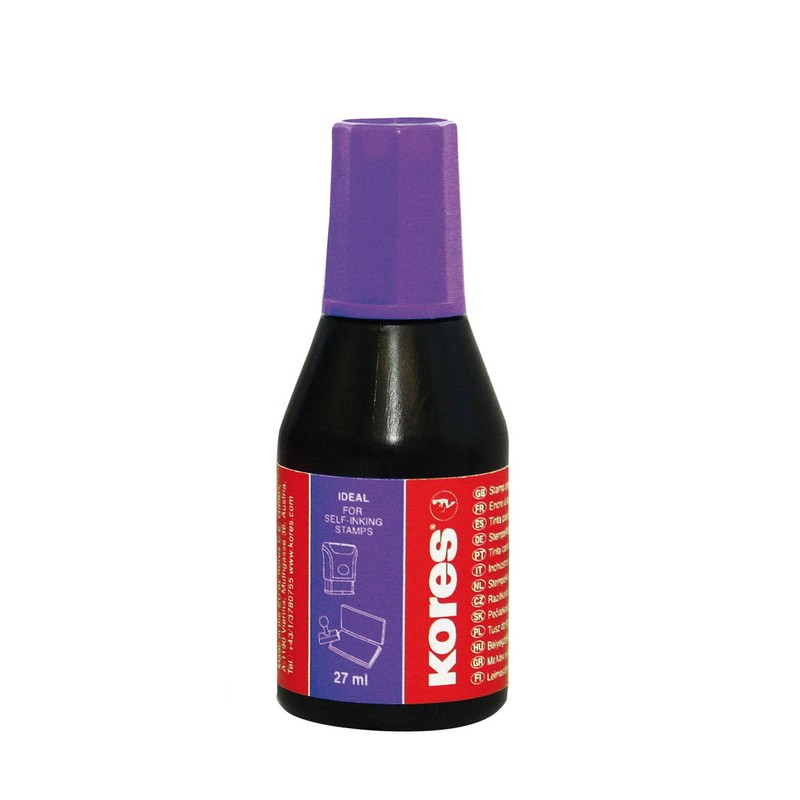 Штемпельная краска Kores на водно-масляной основе в пластиковом флаконе объемом 27 мл. Цвет фиолетовый. Дозатор обеспечивает равномерное нанесение на штемпельную подушку. Подходит для использования со всеми видами резиновых штампов.