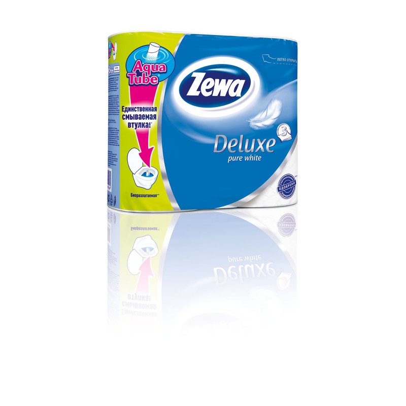 Трехслойная туалетная бумага Zewa Deluxe белого цвета имеет тиснение. Длина намотки в рулоне — 20,7 метра, бумажное полотно разделено перфорацией на 150 листов. Упаковка содержит четыре рулона. Туалетная бумага удобна в использовании благодаря уникальной смываемой втулке. Отличается мягкостью, изготовлена из стопроцентной целлюлозы.