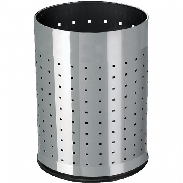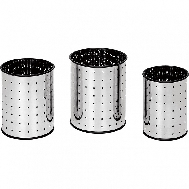 Корзина для бумаг объемом 10 литров изготовлена из нержавеющей стали. Корпус диаметром 20 см имеет небольшие круглые отверстия. Высота — 28,5 см. Подходит для использования мусорных пакетов. Ручки и крышка отсутствуют.
