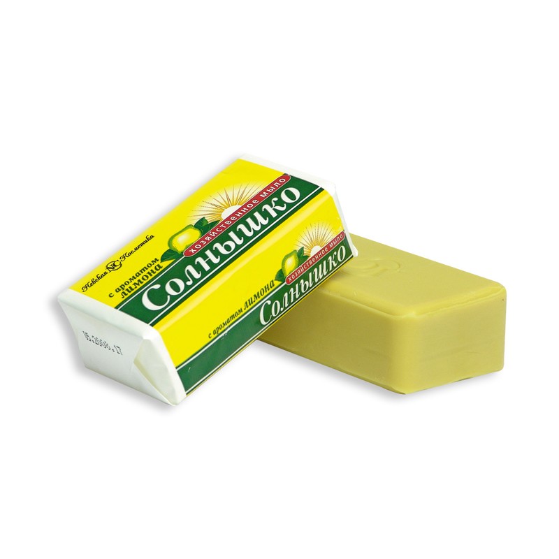 Хозяйственное мыло «Солнышко» предназначено для ручной стирки, мытья рук и посуды. Подходит для замачивания и стирки мелких вещей, создает пышную пену. Придает белью свежий аромат лимона или яблока. Мыло хозяйственное кусковое легко удаляет жир с посуды, при мытье рук не вызывает раздражения кожи. Содержит не боле 72% жирных кислот и большое количество щелочей. Масса нетто — 140 г. Изготовлено по ГОСТ.