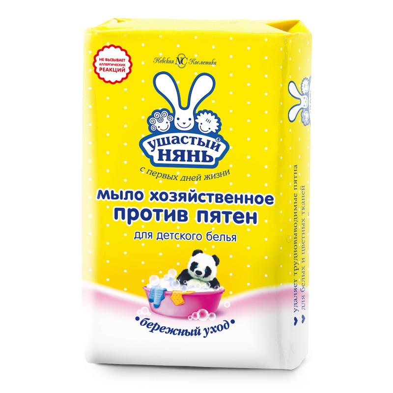 Хозяйственное мыло «Ушастый нянь» предназначено для стирки и удаления пятен с белого и цветного детского белья. Не имеет отдушек, не содержит парфюмерных добавок и красителей, гипоаллергенно. Входящий в состав глицерин защищает кожу от пересушивания, увлажняет и смягчает. Также мыло хозяйственное содержит энзим, способствующий удалению белковых пятен с ткани. Подходит для быстрого застирывания небольших вещей, не требует многократных замачиваний. Масса нетто — 180 г.
