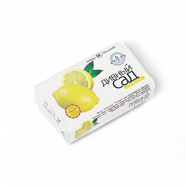 Мыло туалетное кусковое «Дивный сад» с приятным ароматом сочного лимона. При намыливании образует пышную пену. Вес мыла — 90 г.