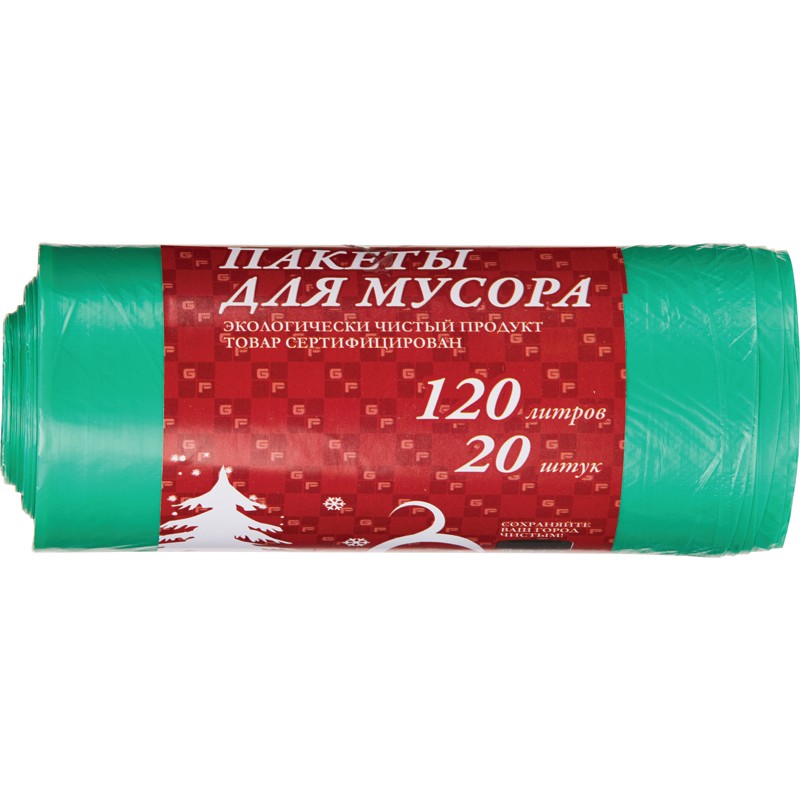 Пакеты для мусора изготовлены из полиэтилена низкого давления. Стойки к действию кислот и растворителей, при больших нагрузках не растягиваются, водо- и паронепроницаемы. Объем пакета 120 литров, размер 70×110 см. Толщина 20 мкм. Упакованы в рулон по 20 штук. Цвет зеленый