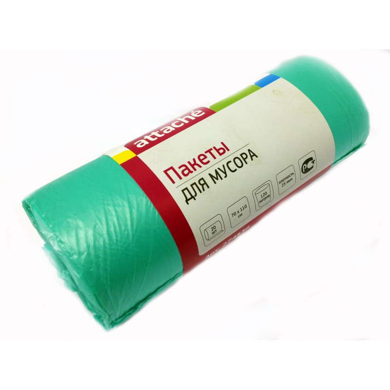 Пакеты для мусора Attache изготовлены из полиэтилена низкого давления, стойки к действию кислот и растворителей, при больших нагрузках не растягиваются, водо и паронепроницаемы. Объем пакета 120 литров, толщина 20 мкм. Упакованы в рулон по 20 штук. Цвет зеленый.