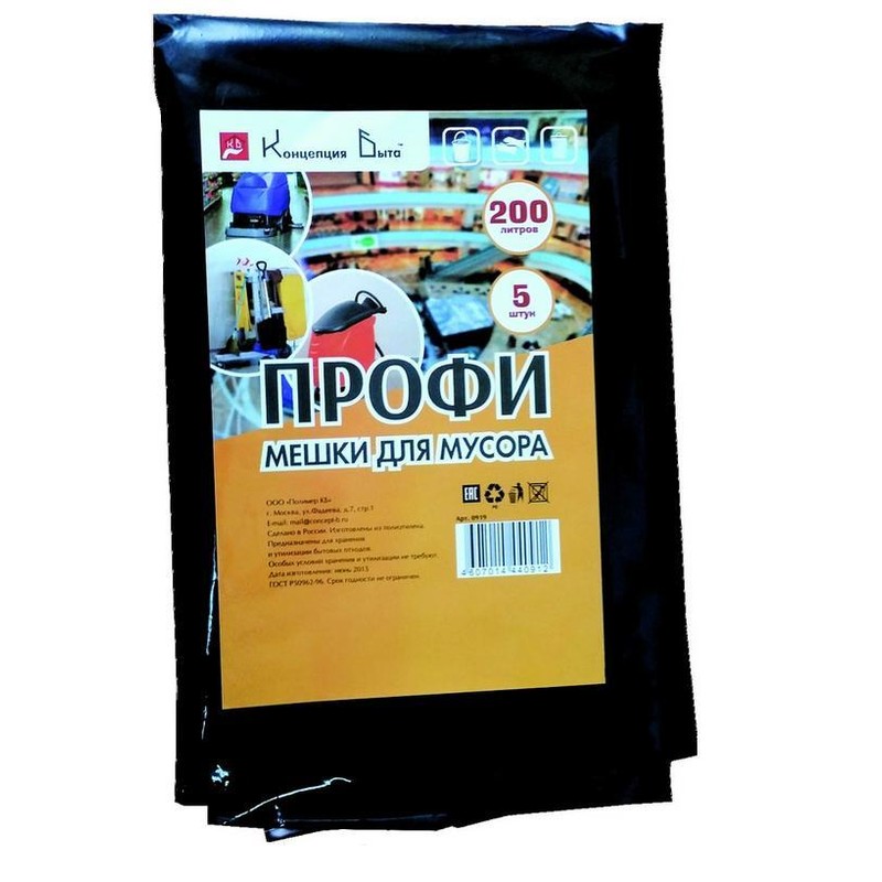 | Пакеты для мусора Концепция Быта Профи, ВД, 200 л, 90*130см, 65 мкм, 5шт/пач |