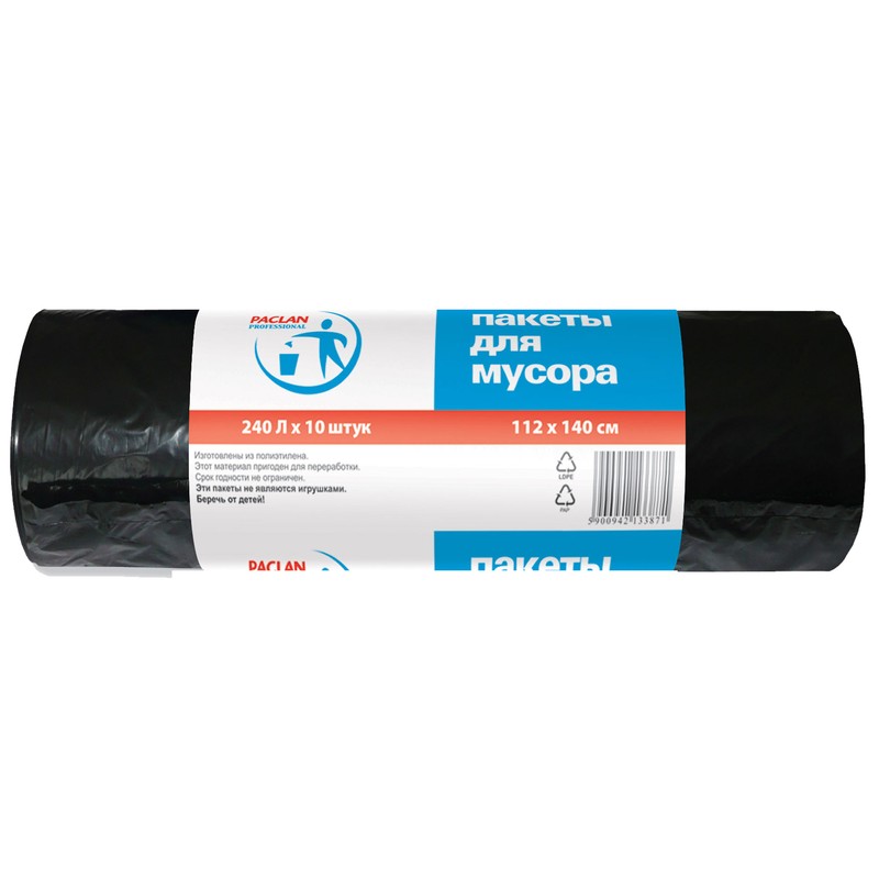 Пакеты для мусора Paclan Professional объемом 240 литров изготовлены из полиэтилена высокого давления. 10 штук в упаковке. Размер пакета 140×112 см., плотность 30мкм. Пакеты упакованы в рулон по 10 штук. Цвет черный. Произведено в России.