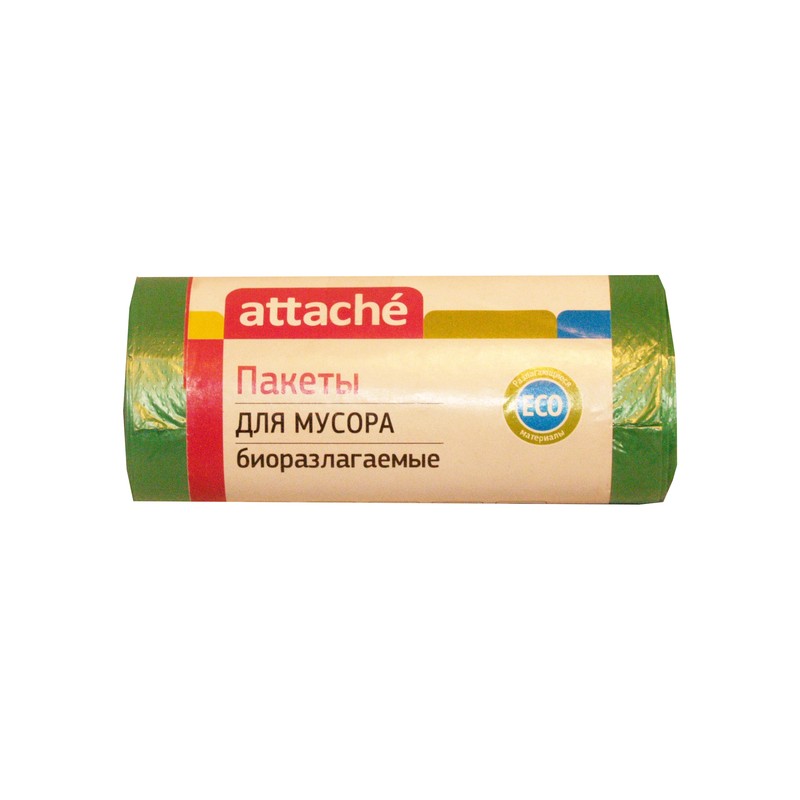 Пакеты для мусора Attache сделаны из полиэтилена низкого давления. Стойки к действию кислот и растворителей, при больших нагрузках не растягиваются, водо и паронепроницаемы. Объём пакета 60 литров. Упакованы в рулон по 30. Размер 58×68 см. Плотность — 12 мкм. Цвет зеленый.