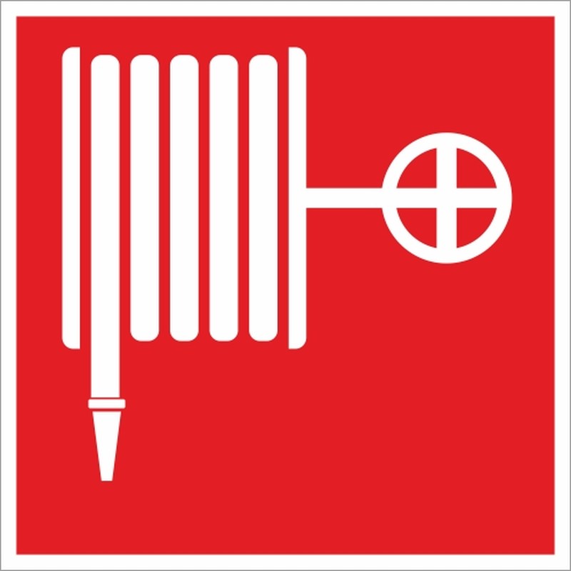 Знак безопасности F02 «Пожарный кран», предназначенный для размещения в местах нахождения комплекта пожарного крана с пожарным рукавом и стволом. Изготовлен из полимерной пленки, имеющей фотолюминесцентное покрытие, заметное даже в условиях слабого освещения. Знак размещается на стенах и дверях, благодаря самоклеющейся основе хорошо держится на любом материале. Размер — 200×200 мм.