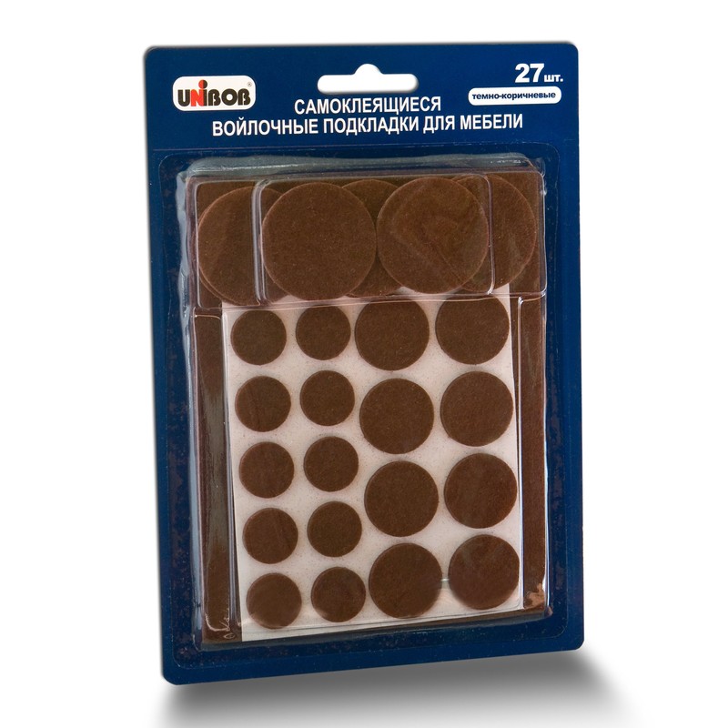 Набор подкладок Unibob с клеевой поверхностью. Изделие используется для защиты напольных покрытий от царапин, оставляемых ножками мебели, изготовлено из войлока коричневого цвета, надежно крепится к деревянным и пластиковым поверхностям и не оставляет следов после снятия. Набор состоит из 27 кругов-подкладок разного диаметра.