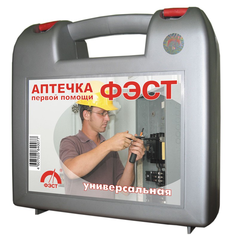 Универсальная аптечка «ФЭСТ» используется для оказания первой неотложной помощи в экстренной ситуации на производстве. Рассчитана на 7 человек. Аптечка содержит обезболивающие средства, дезинфицирующие вещества и перевязочные материалы. Упакована в пластиковый футляр в форме чемодана с защелкивающимися клипсами.