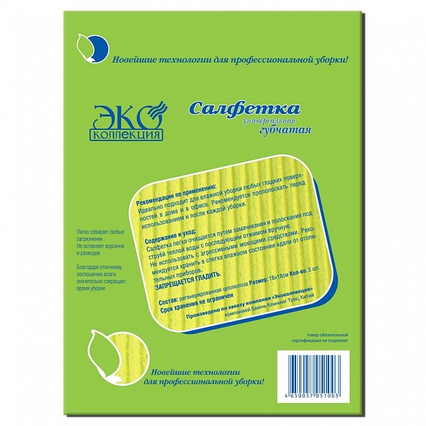 Название торговой марки ЭкоКоллекция Торговая марка ЭкоКоллекция Страна происхождения Китай Схема вложения 100 Материал салфеток губчатая целлюлоза Назначение салфеток для любых поверхностей Артикул 219430 -