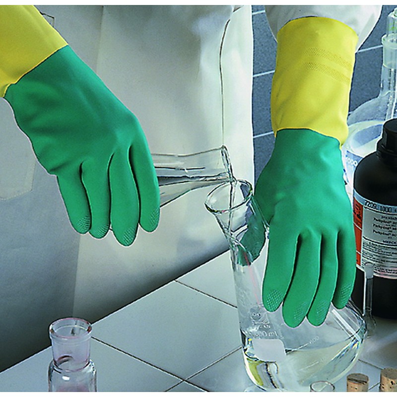 Перчатки Ansell «Бай Колор» (размер 8,5-9,0) — надежное защитное средство для рук, устойчивое к действию спирта, солей, концентрированных кислот (до 80 %) и щелочей (до 50 %), вредных растворителей. Внешняя оболочка из латекса и неопрена обеспечивает надежный хват даже на влажных поверхностях. Напыление из хлопка на внутренней части перчаток предотвращает раздражение. Имеют рифленую поверхность для обеспечения более надежного захвата. Ароматизированы ванилью. Модель толщиной 0,68 мм используется в авиационной и химической промышленности. Длина перчаток 32,3 см.