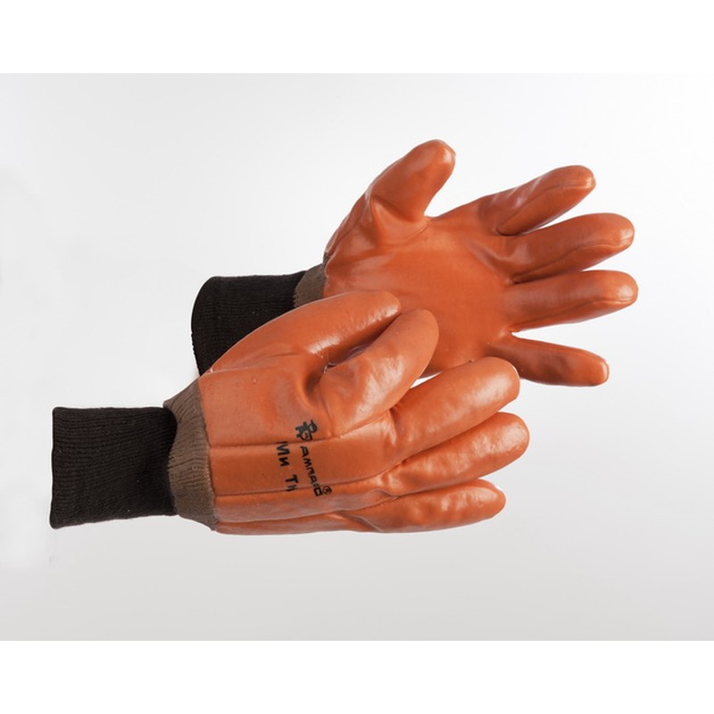 Утепленные перчатки «Арктика» с манжетой на резинке, изготовленные на основе хлопчатобумажного трикотажа оранжевого цвета. Имеют поролоновую подкладку толщиной 4 мм и водонепроницаемое морозостойкое покрытие из поливинилхлорида. Перчатки надежно защищают от неблагоприятных погодных условий, горячих масел, нефтепродуктов и механических повреждений. Модель выдерживает температуру до −20 °С. Размер перчаток — 10.