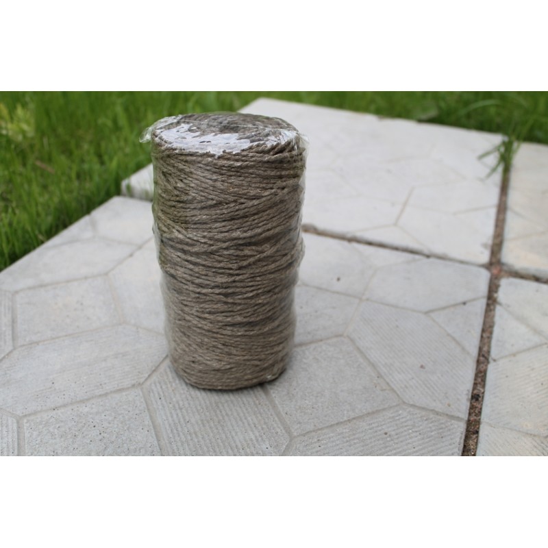 Льняной шпагат естественного темно-бежевого цвета. Полированный шпагат в бобине длиной 200 метров. Толщина — 2,4 миллиметра, плотность материала — 4,2 кТекс. Бобина весит 1 кг. Соответствует ГОСТу 17308-88.