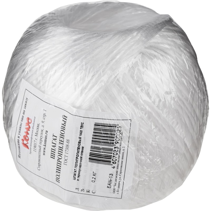 Крученый шпагат изготовлен из прочного полипропилена белого цвета, намотан на бобину (общая длина — 125 метров). Вес составляет около 200 гр. Толщина — 2 мм, выдерживает нагрузку до 80 кг на сантиметр длины. Подходит для упаковки и переноски различных грузов. Шпагат соответствует ГОСТу 17308-88.