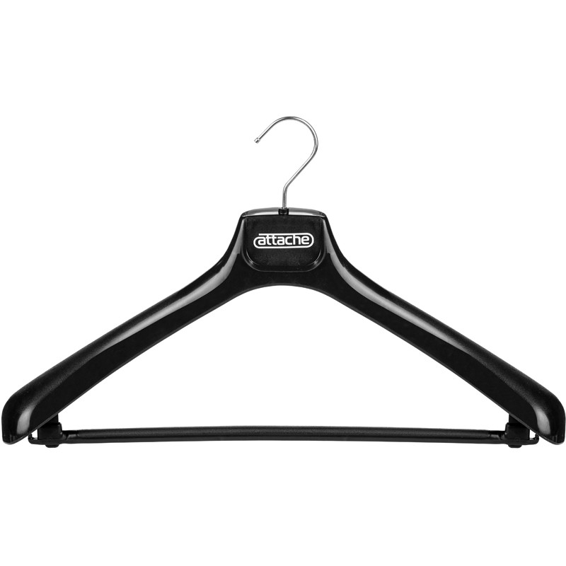 Плечики Attache из пластика черного цвета предназначены для одежды размера 50-52. Металлический крюк-держатель вращается. Прочные плечевые дуги с утолщением. Внизу съемная перекладина для юбок и брюк. Плечики подходят для верхней одежды.