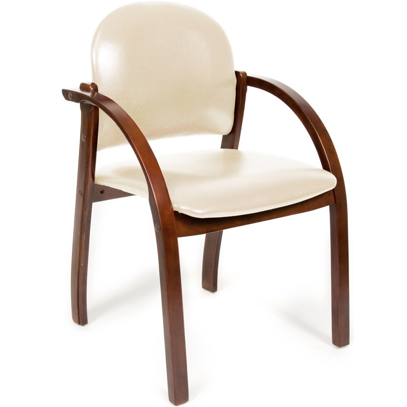 Каркас с четырьмя ножками изготовлен из массива дерева цвета темный орех. Сиденье и спинка обиты искусственной кожей бежевого цвета (матовый). Подлокотники эргономичной формы. -
