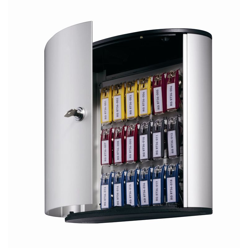 Ящики для ключей настенные из листового алюминия - на 18 брелоков с закрытием на ключ (2 ключа в комплекте). В комплекте к каждому боксу - 6 брелоков ассорти и комплект для крепления к стене. Брелоки вешаются между крючками, гарантируя максимальную наглядность. Есть возможность замены маркировки брелока (маркировка этикеток от руки или при помощи шаблона на компьютере), замены маркировки планки, на которой висят брелоки. Планки можно передвигать, расширяя или сужая расстояние между ними, в зависимости от длины ключей. На внутренней стороне дверцы - титульный лист для перечня ключей.