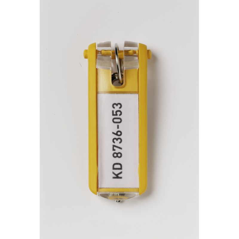 Набор из шести брелоков Durable, использующихся в ящиках для хранения ключей. Изделия изготовлены из ударопрочного пластика желтого цвета. Брелоки имеют специальную табличку для маркировки, можно подписать этикетку вручную или с помощью компьютера.