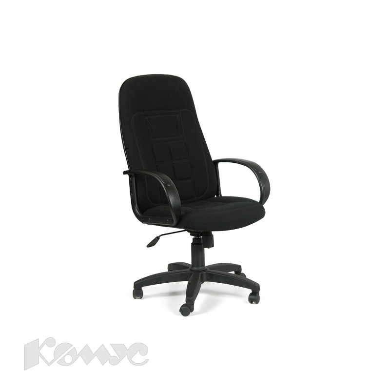 Кресло для руководителя обито износоустойчивой синтетической тканью черного цвета, крестовина изготовлена из пластика. Механизм Top Gun позволяет осуществлять свободное качание с фиксацией в рабочем положении.