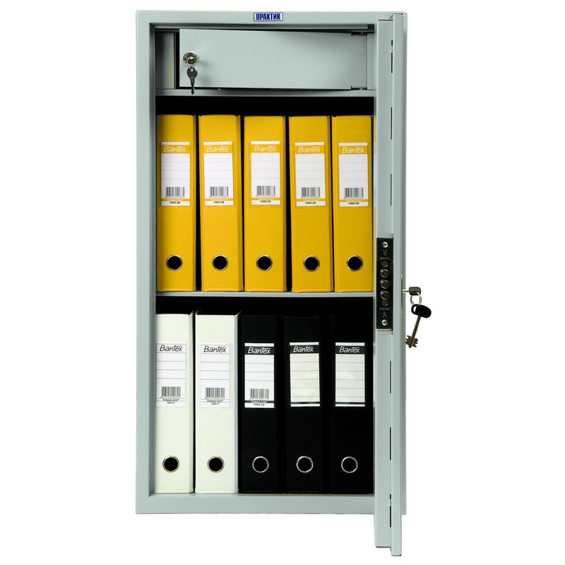 Шкаф для документов (сейф) «Практик» изготовлен из металла порошковым покрытием серого цвета. Размеры — 87×46 см, глубина — 34 см. Оснащен ключевым замком. Внутри одна съемная полка с возможностью регулировки высоты, а также отделение, запирающееся на отдельный ключ (трейзер). Шкаф удобен для хранения архивных папок.